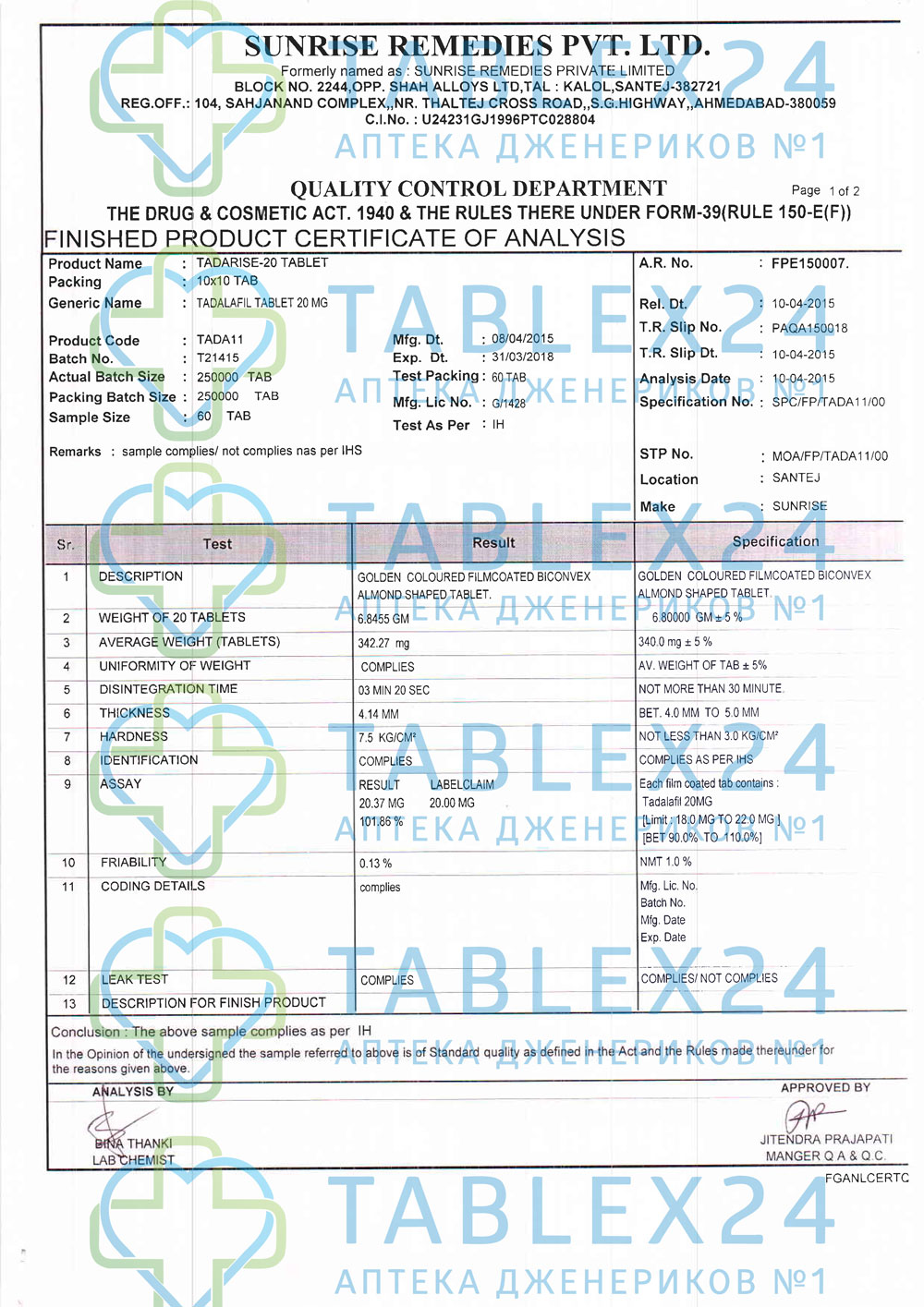 Тадарисе 20 приобрел известность как качественный и эффективный дженерик известного регулятора потенции Сиалиса. В составе лекарственного средства содержится максимальная суточная доза тадалафила, который помогает противостоять проявлениям половой слабости и восстанавливать способность мужчины к достижению и длительному сохранению стойкости полового члена. Производство лекарства ведется на одном из крупных предприятий Индии, а отзывы об его использовании впечатляют успехами терапевтического действия.
