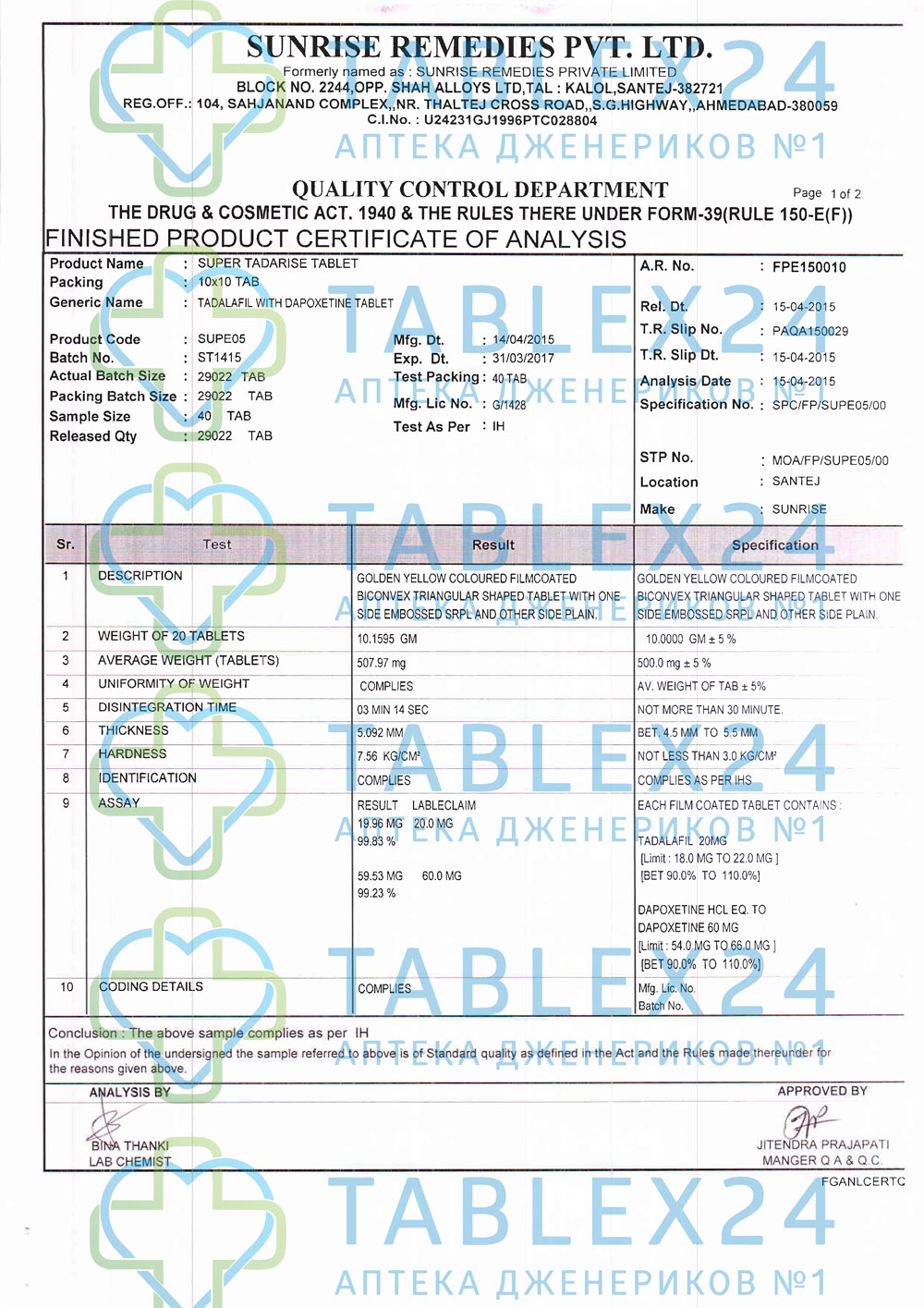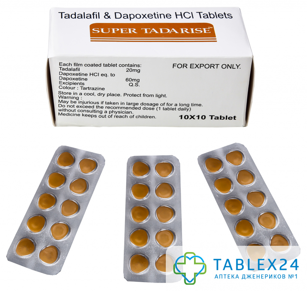 В качестве пролонгатора в составе препарата Super Tadarise выступает дапоксетин. Его задача состоит в ослаблении активного воздействия серотонина с целью снижения скорости рефлекторных реакций организма. Процесс эякуляции задерживается, благодаря чему существенно продлевается время полового акта. Кроме того, дапоксетин проявляет эффект антидепрессанта, что способствует устранению нервозности и снятию нервного напряжения, естественно возникающего у мужчин, страдающих интимными расстройствами.