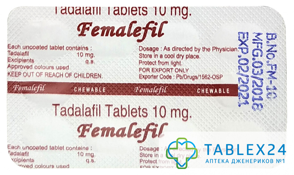 Число «10» в названии дженерика Femalefil свидетельствует о том, что мы имеем дело с препаратом каждая пилюля которого содержит 10 миллиграммов Тадалафила. Это стандартная дозировка, а потому не следует принимать в течение суток более 1 пилюли. Впрочем, в этом нет необходимости, поскольку действие препарата начинается через 45 минут с момента приёма и длится 36 часов.